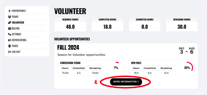 d. Here you will see all of the available sessions. You will also find a summary at the top of the page showing your status of required, completed and committed hours. To sign up for a shift choose MORE INFORMATION on the specific session and to jump in to the session and available volunteer shifts.
