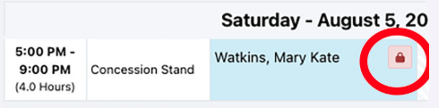 If you are within the window of time set by IFYHA where you are unable to cancel your shift assignment, you'll see a lock icon instead, indicating that you'll need to get in touch with the volunteer coordinator to be removed from the shift: