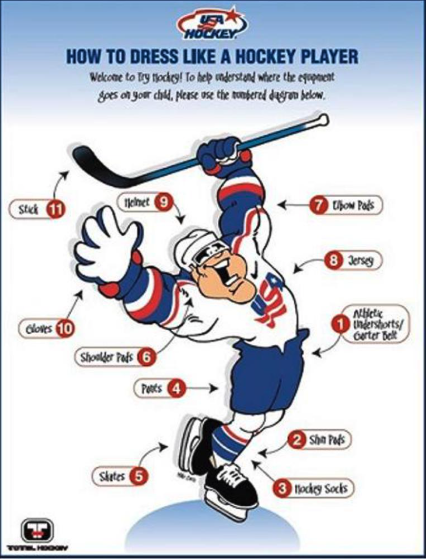 Each new player is responsible for obtaining skates, neck gaurd, a stick, mouth guard, hockey socks and protective cup. (Hockey skates you can lease at the Sport Shop here in town as well as buy any of the listed equipment you are responsible for)